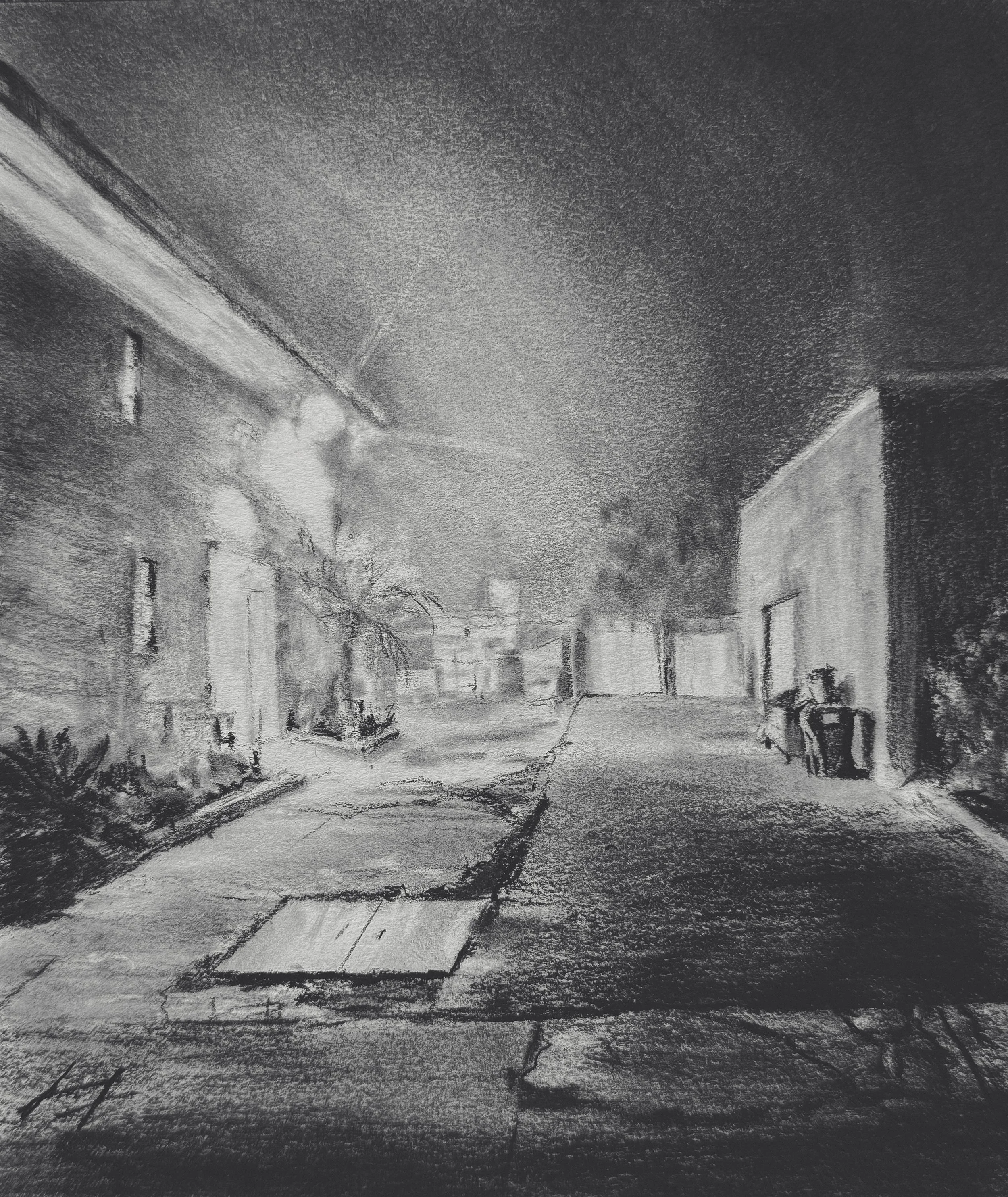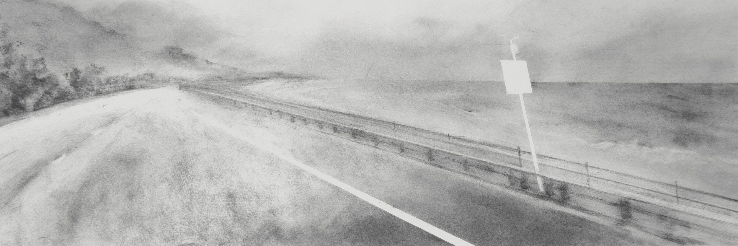 These drawings offer fragments of that awareness: komorebi, sunlight filtering through leaves; the blurred glow of light bokeh; tulips bowing to time; a bed that keeps the shape of someone’s absence; a tree perched over an abyss; two oaks standing together; the soft shimmer of a warm night alley; the midway point of a highway that vanishes into dusk.