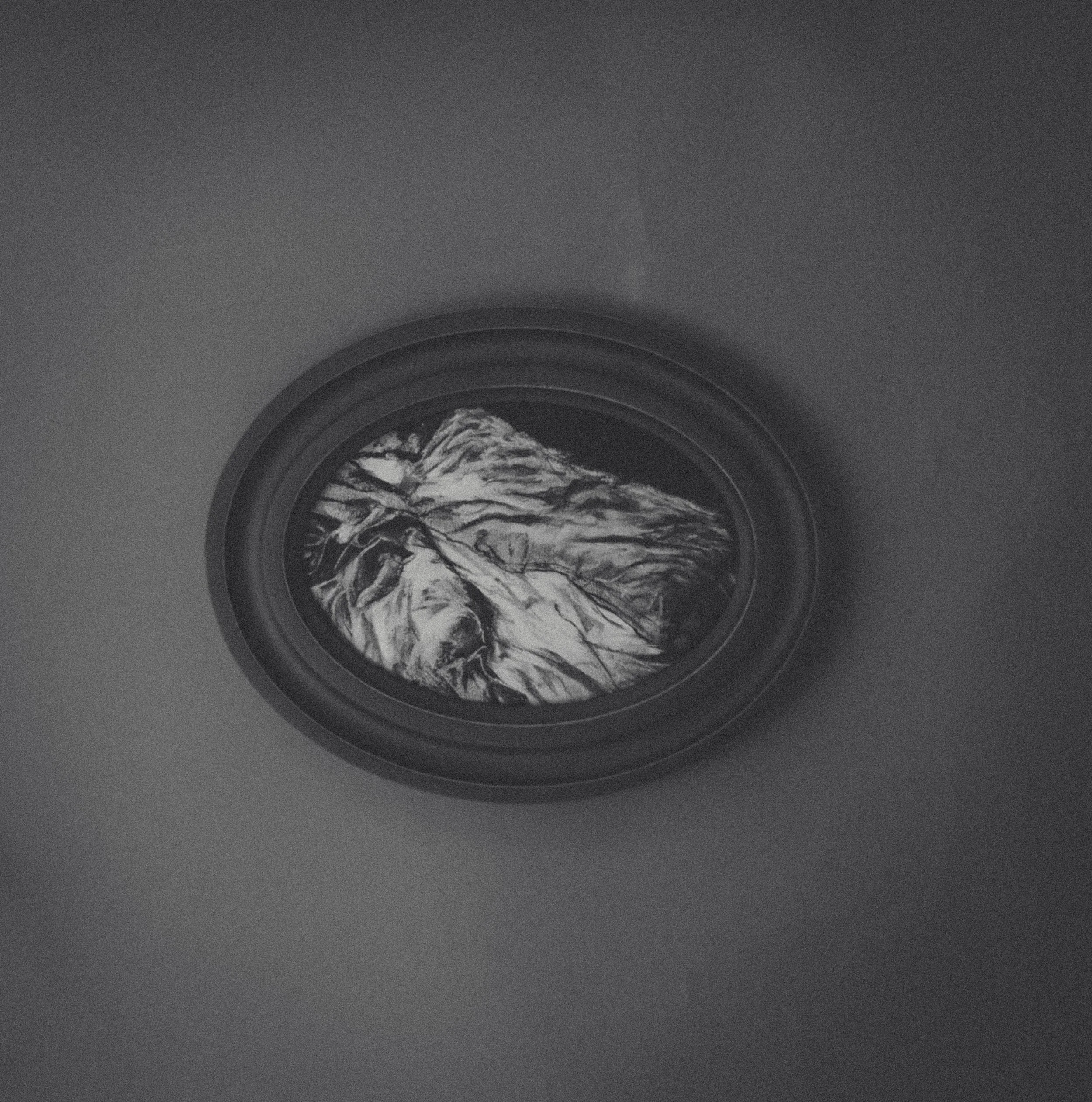 Charcoal on paper. Charred frame around it.